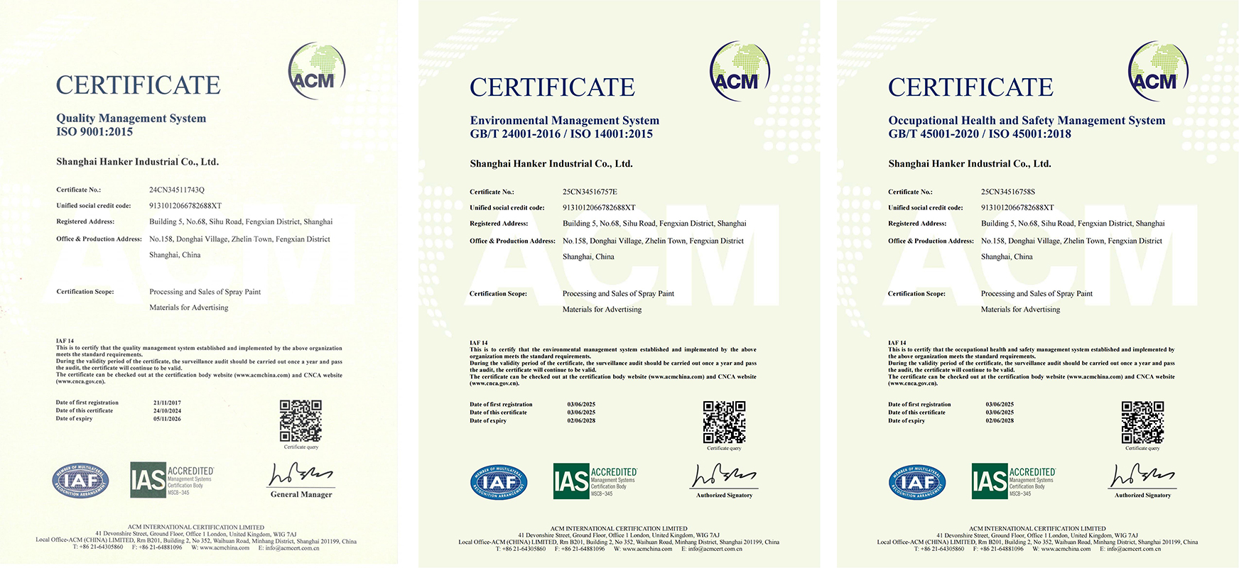 Недавно Shanghai Hanker Industrial Co., Ltd. (называемый «Hanker») успешно получил сертификацию системы управления качеством ISO 9001: 2015, сертификация системы управления Environments Environments, а также сертификация системы управления охраной и системой труда ISO 45001 с помощью аудита ACM International Certification Limited. Это достижение демонстрирует, что компания полностью соответствовала международным стандартам в области контроля качества, защиты окружающей среды и безопасности сотрудников. Приобретение этих трех системных сертификатов является результатом долгосрочной приверженности Ханкера стандартному управлению. Оптимизируя производственные процессы, создавая механизмы предотвращения и контроля экологических рисков, а также улучшение систем обучения по охране труда и безопасности, компания достигла стандартизированного контроля над всей цепью от закупок сырья до готового продукта. В будущем, принимая эти сертификаты в качестве фонда, Hanker еще больше углубит технологические инновации и модернизацию управления, активно способствует сотрудничеству с традиционным исследованием в отрасли с университетами, изучает передовые приложения в области материалов и способствует высококачественному развитию промышленности.